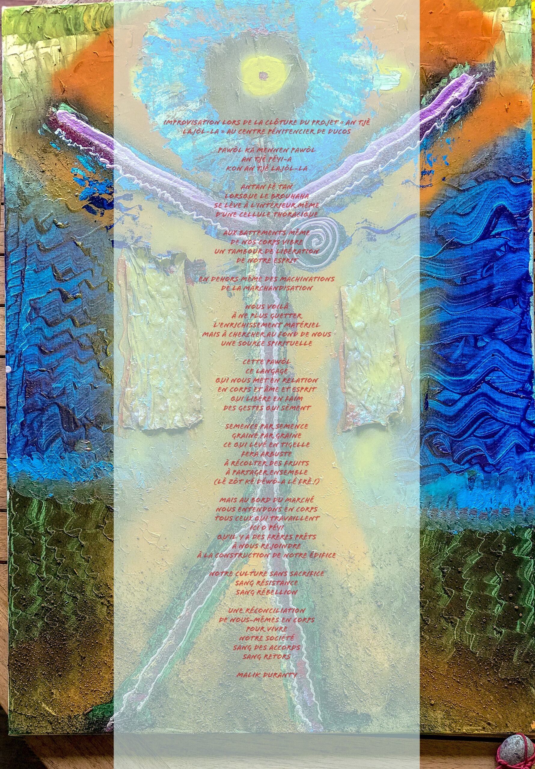 De mots en mots, de tour en tour, dans une dynamique d’écriture orale, non-loin d’une écriture-automatique collective, prenait forme un poème sur-réaliste de nous tous joints en une seule pawòl.