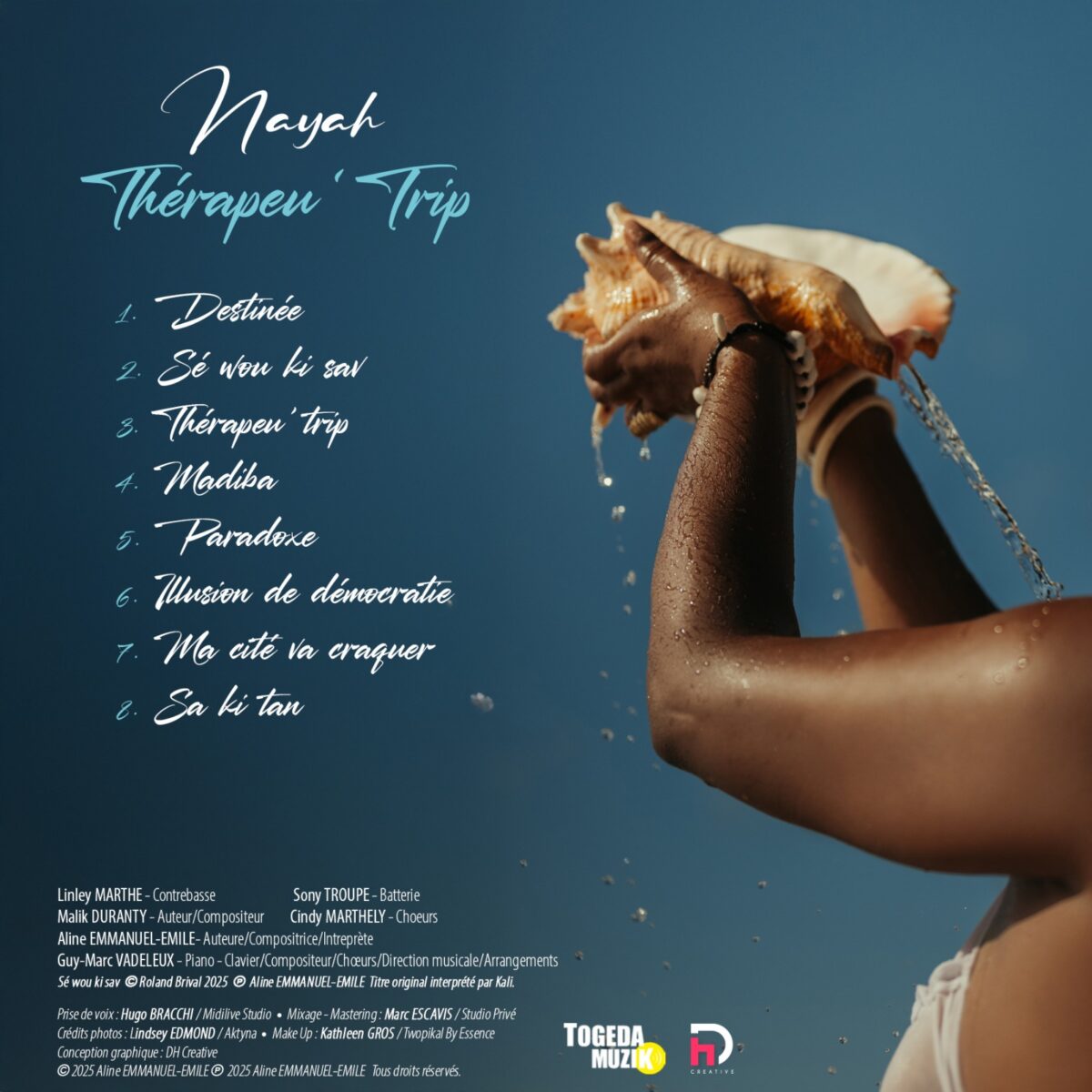 L’album Thérapeu’Trip est le fruit d’une démarche de création musicale originale, portée par l’intention de Nayah, réalisée sous la direction artistique et musicale de Guy-Marc Vadeleux et par la collaboration fraternelle avec des musiciens chevronnés tel que Linley Marthe et Sonny Troupé, Cindy Marthely et l’auteur Malik Duranty.